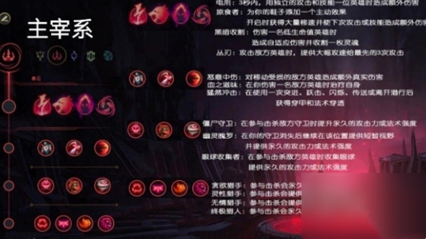 2、主宰系符文搭配:电刑、掠食者、黑暗收割丛刃、恶意中伤、血之滋味、猛然冲击、僵尸守卫、幽灵魄罗、眼球收集者,主要是以伤害为核心,以此来提升法术伤害和移速攻速;