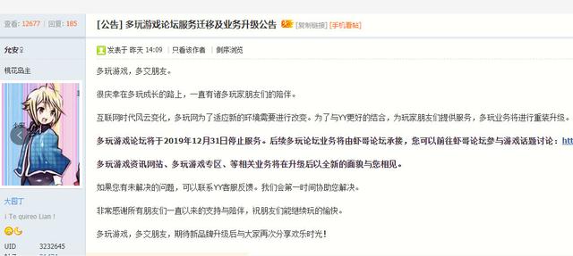 而曾经很有名的多玩网,现在也宣布即将关闭旗下的多玩论坛,并将于今年 12 月 31 日后停止服务。对此,多玩论坛的官方发布了短短的几句公告:“多玩游戏,多交朋友。很庆幸在多玩成长的路上,一直有诸多玩家朋友的陪伴。”
