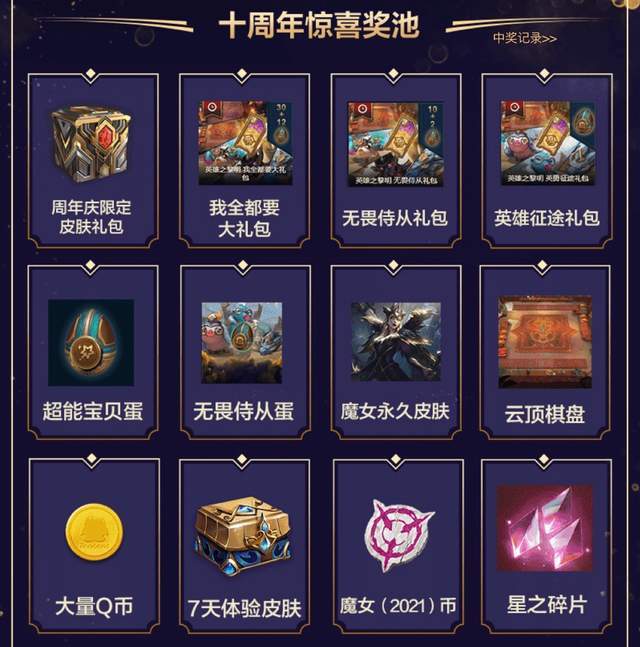 在活动中英雄联盟玩家将获得海量的奖励,比如云顶之弈的玩家可以获得超能宝贝蛋、无畏侍从蛋、云顶棋盘等等。而对于喜欢在召唤师峡谷驰骋的玩家来说,同样会获得极为丰厚的奖励:周年庆限定皮肤礼包、我全都要大礼包、英雄征途礼包等等。除此之外,玩家还可以获得Q币、体验皮肤等等。