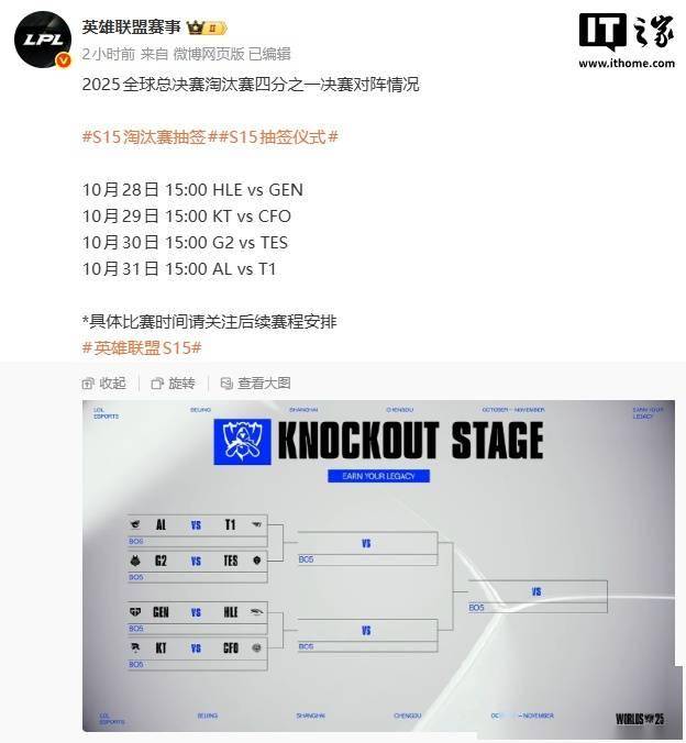 2025-10-27英雄联盟赛事官网,英雄联盟官方网站,英雄联盟投注网站IT之家 10 月 25 日消息,《英雄联盟》2025 全球总决赛(S15)四分之一决赛抽签刚刚公布,LPL 赛区 TES 战队对阵 G2,AL 战队对阵 T1,将进行 BO5 的比拼。