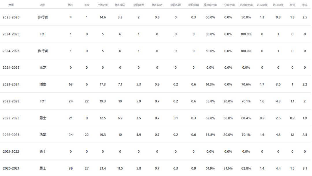 勇士队曾将怀斯曼视为球队未来的重要基石,倾注了大量精力与期待,但其表现未能达到期望,最终在2023年初被交易至底特律活塞,成为培养计划的失败案例。尽管转会后曾有过短暂的亮眼表现,如在22-23赛季末段代表活塞出战24场比赛中的22场首发,场均贡献12.7分和8.1个篮板,但这些依然难掩他的职业轨迹不稳。