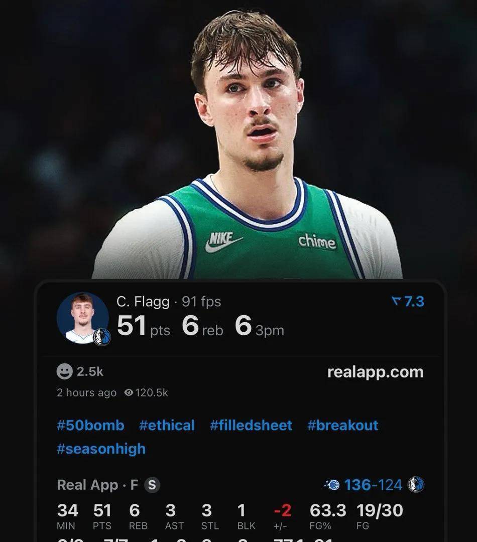 在独行侠的队史记录簿上,弗拉格的名字正在被快速书写。 本场51分之后,队史新秀单场得分榜的前三位已全部被他占据:2026年4月4日的51分高居榜首,2026年1月29日的49分位列次席,2025年12月16日的42分排在第三。 他几乎是以一己之力,重新定义了这支球队的新秀天花板。