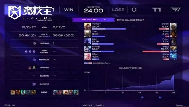 比赛开局KT迅速占据主动,上路PerfecT杰斯对线单杀Doran安蓓萨,直接打出一血。随后KT三线压制,中下两路同样打出优势。打野Cuzz潘森节奏拉满,多次游走命中关键控制,连续抓到T1双C,KT轻松控下前期所有关键资源。进入中期,T1阵容手短的问题被无限放大,面对KT的消耗与推进毫无还手之力。20分钟关键节点,Keria冰鸟配合队友抓单却被反打击杀,KT顺势收下大龙彻底锁定胜局。最终在下路团战中KT轻松取胜,以12-0的击杀比零封T1,拿下首局。