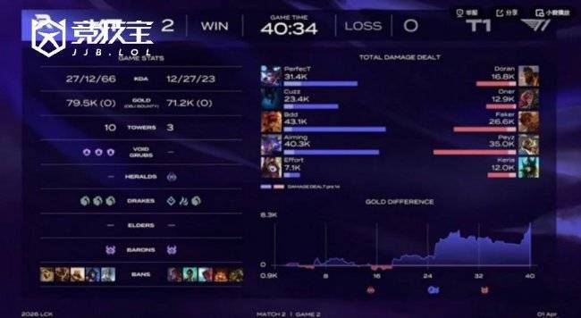 第二局KT延续强势发挥,PerfecT后手选出薇恩,对线继续压制Doran奎桑提。前期T1依靠Faker岩雀的游走,在下路打出击杀建立优势。不过进入中期后,KT上中野全面接管比赛。Bdd安妮完成对位单杀Faker岩雀,并在关键小龙团中大招命中双C,帮助Aiming芸阿娜收获三杀,一举扭转局势。KT顺势控下大龙扩大经济领先。虽然T1依靠Faker岩雀岩突配合Peyz库奇抢下大龙短暂稳住局面,但在龙魂团中T1追击过深,阵型脱节。Bdd安妮再次抓住机会完成关键控制,KT打出0换4。更致命的是,T1下路双人组在草丛回城被抓,KT乘势推进结束比赛,以2-0横扫T1拿下开门红。